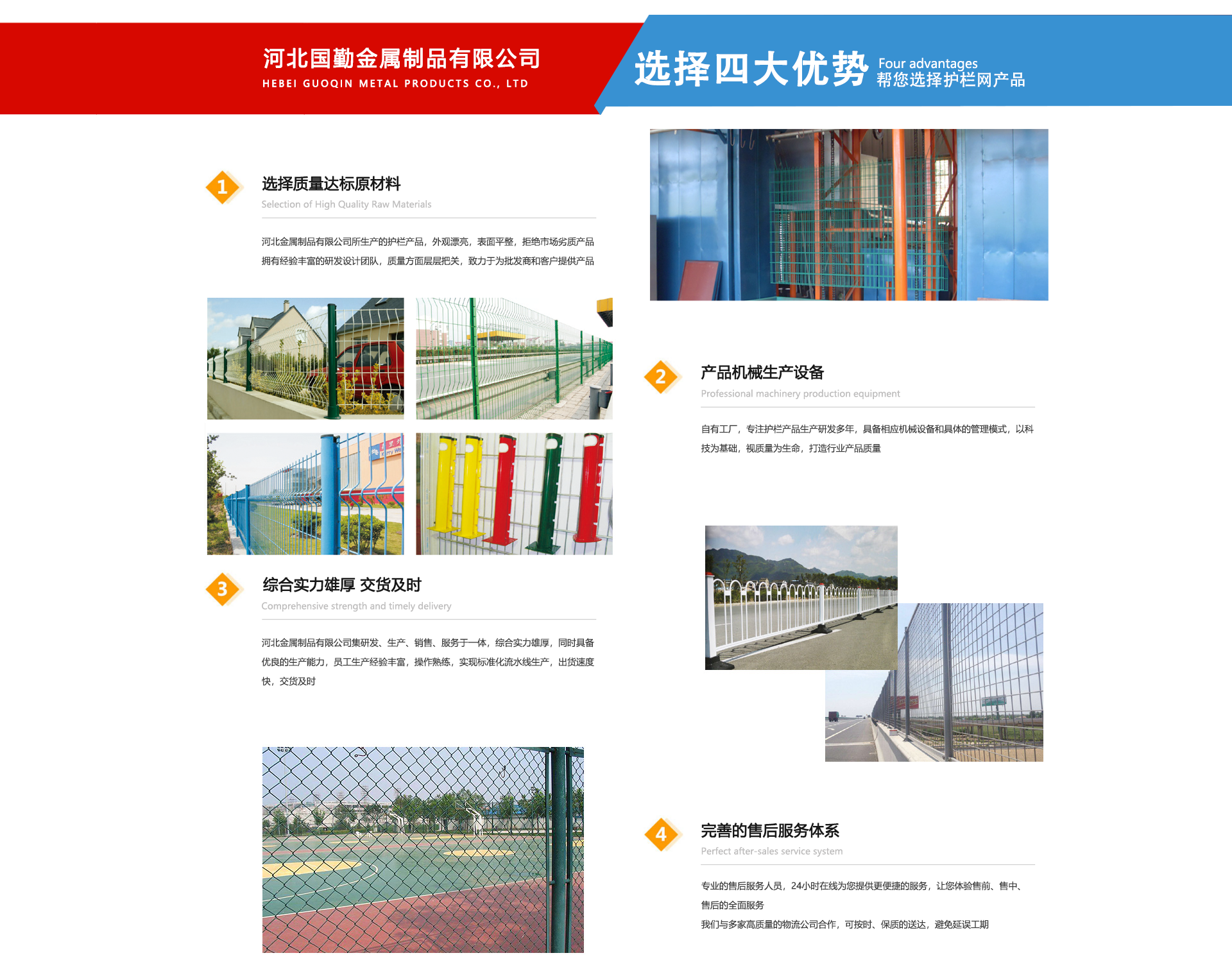 河北國勤金屬制品有限公司位于亞洲較大的絲網(wǎng)生產(chǎn)基地--享譽(yù)世界的“中國絲網(wǎng)之鄉(xiāng)”美譽(yù)的河北省安平縣境內(nèi)。主要是以研發(fā)設(shè)計(jì)、制造生產(chǎn)、銷售服務(wù)于一體的高科技現(xiàn)代化企業(yè)。河北國勤金屬制品有限公司主營產(chǎn)品有護(hù)欄網(wǎng),隔離網(wǎng),市政工程,草坪護(hù)欄等各種系列產(chǎn)品的制造廠家。我廠產(chǎn)品被廣泛應(yīng)用于公路、石化、化工、港口、合金、電力、造紙、鋼鐵、建材、市政、石油、污水處理及一般工業(yè)廠房、市政建設(shè)等各個(gè)領(lǐng)域。公司自成立以來一直為客戶提供優(yōu)良,貼心的服務(wù)。從售前售中售后我們都以客戶為導(dǎo)向,以設(shè)計(jì)先進(jìn)、高科技手段、價(jià)格低質(zhì)量優(yōu)等多方面為客戶提供整體全面的服務(wù)。我們相信科技創(chuàng)新的力量,本廠在產(chǎn)品技術(shù)基礎(chǔ)上不斷探索與創(chuàng)新,力求以更高品質(zhì)的產(chǎn)品、更合理的價(jià)格、更完善的售后服務(wù)、不斷豐富的產(chǎn)品線滿足于每一位客戶的需求。